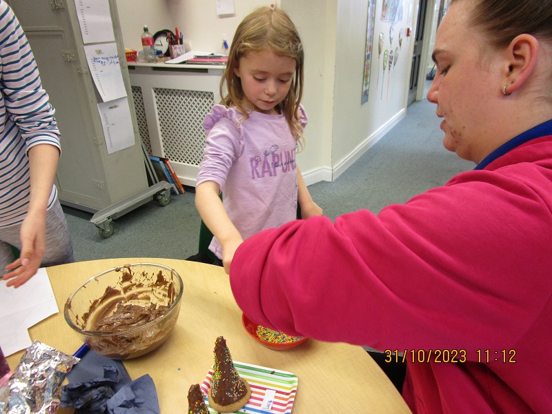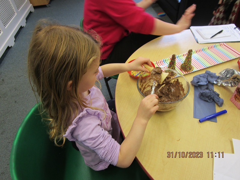 The children really enjoyed the baking activity over the holidays. We took an ice cream cone and covered it in chocolate. The children then rolled the chocolate cone in rainbow sprinkles. After this they placed the cone on top of a biscuit. Chocolate fingers then had to be licked clean!
